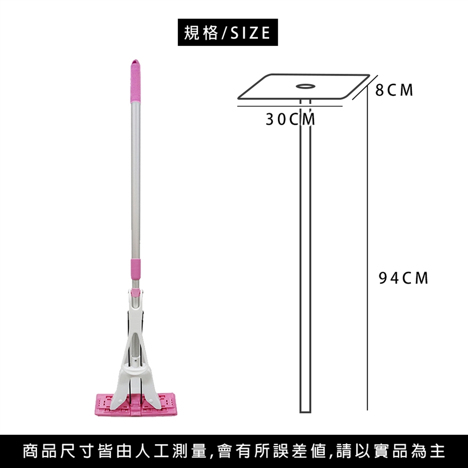 ------------------------------------------------------------------------------------------------------------------------ 【產品特色】 (1)提拉擠水拖把,免沾手,良好效率。 (2)卡扣式拖把膠棉頭可更換,不須使用工具,方便快速。 (3)溝槽設計,灰塵/毛髮不殘留,徹底清潔。 【產品內容/材質】 . 尺寸:30x8x94cm±5% . 材質:PVA棉頭、PP塑膠配件、鋁合金桿 . 產地:台灣 ------------------------------------------------------------------------------------------------------------------------